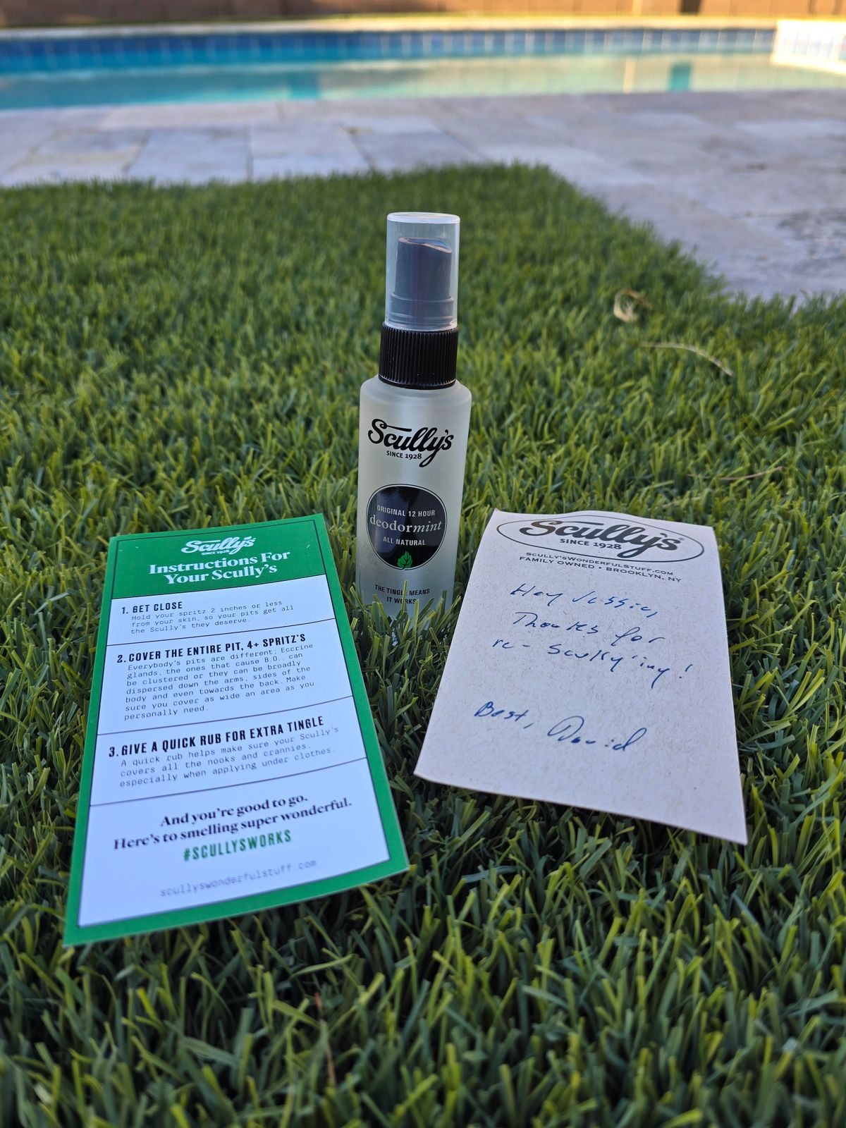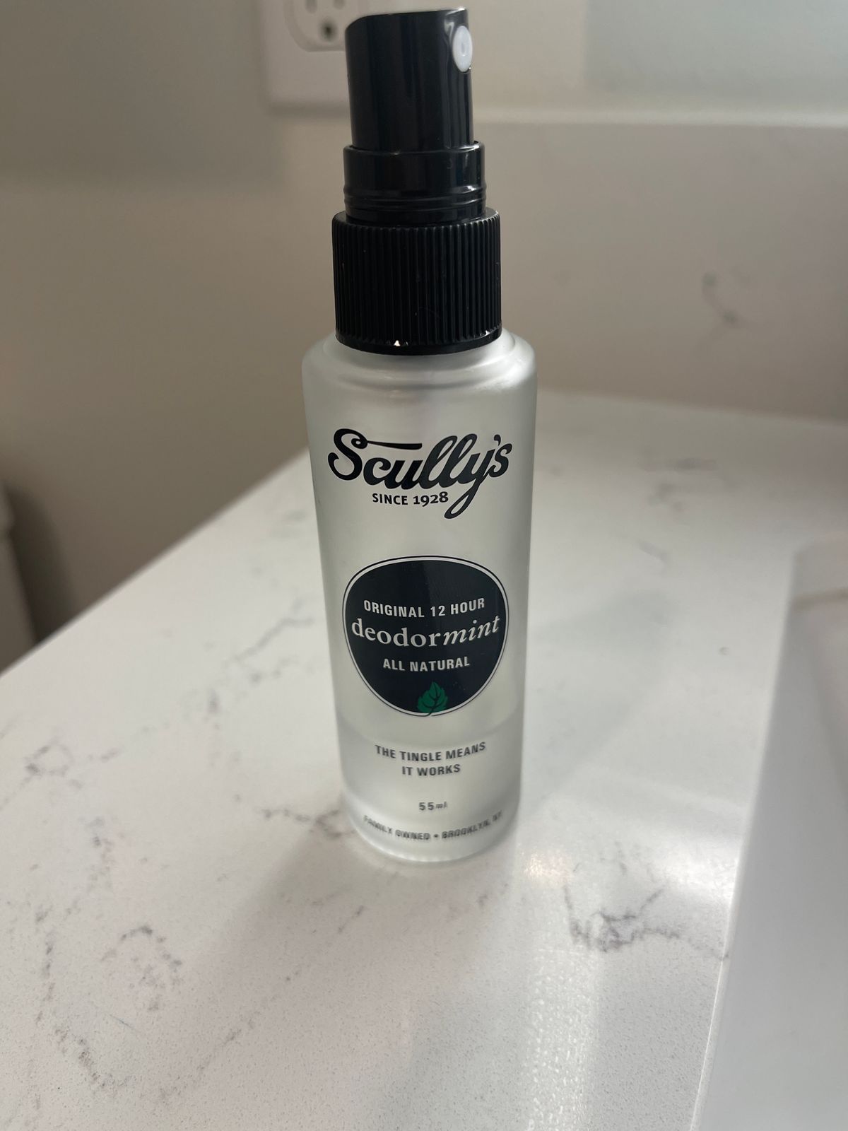 Scully’s Deodormint – Natural Deodorant Spray for Sensitive Skin (2oz)Scully's is the first natural and chemical-free deodorant that actually works. It's unisex and safe for kids and pregnant / nursing women, while being strong enough for men too. Aluminum-free, no parabens, non-toxic, and cruelty-free with no artificial fragrance. It comes in a sturdy frosted glass bottle. Spritz each underarm 3-4 times, rub it in to smell fresh for 12+ hours. Perfect for sensitive skin. The tingle means it works. Pairs perfectly with the Scully's Deodormint Refill.